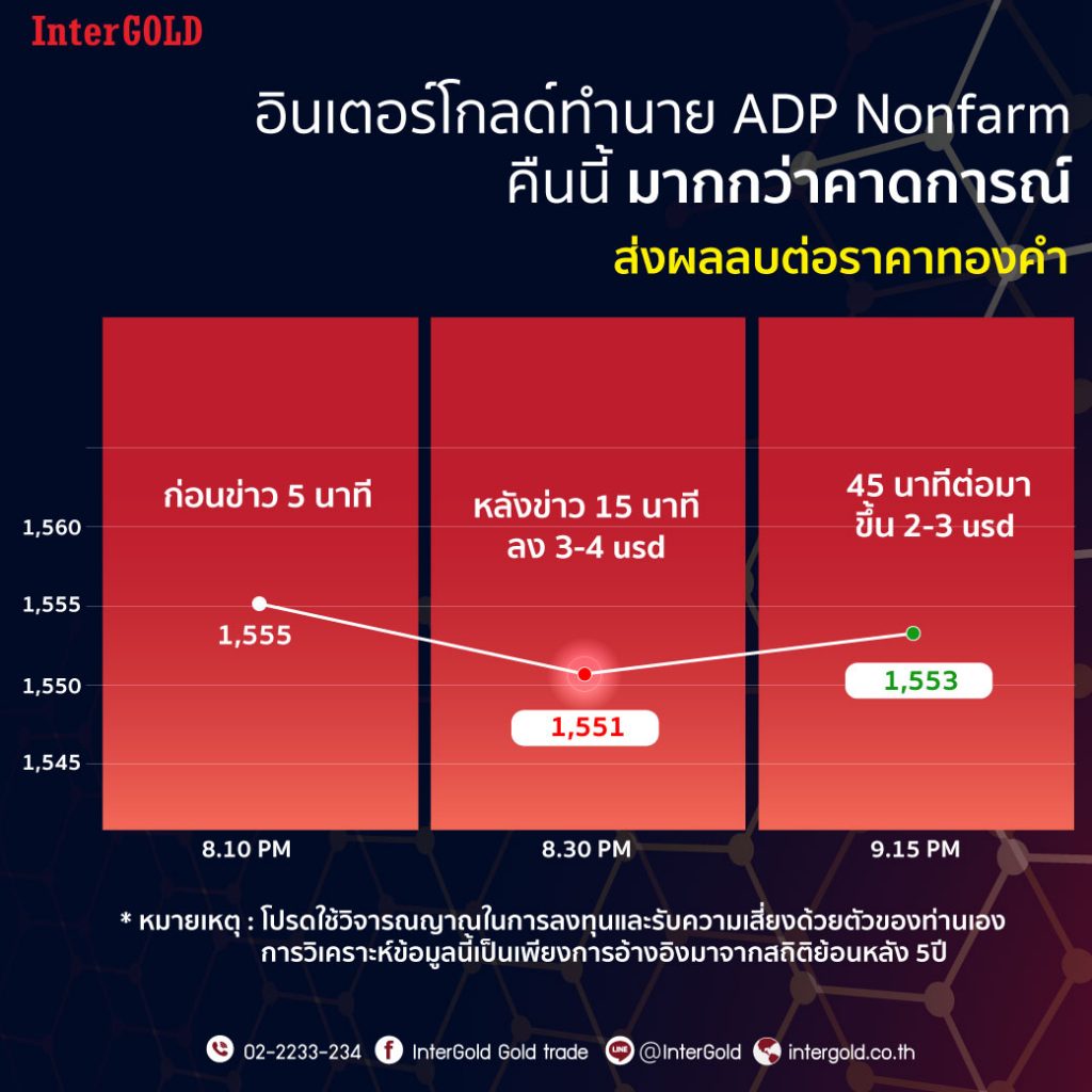 - มากกว่าคาดการณ์ จากสถิติเมื่อข่าว ADP Nonfarm Payroll ออกมามากกว่าที่คาดการณ์ไว้ จะเห็นได้ว่าค่าเฉลี่ยภายใน 15 นาที มีโอกาส 92% ที่ราคาทองจะย่อลง 3-4 เหรียญ และหลังจากนั้นภายใน 45 นาทีต่อมา มีโอกาสที่ทองจะขึ้น 2-3 เหรียญ