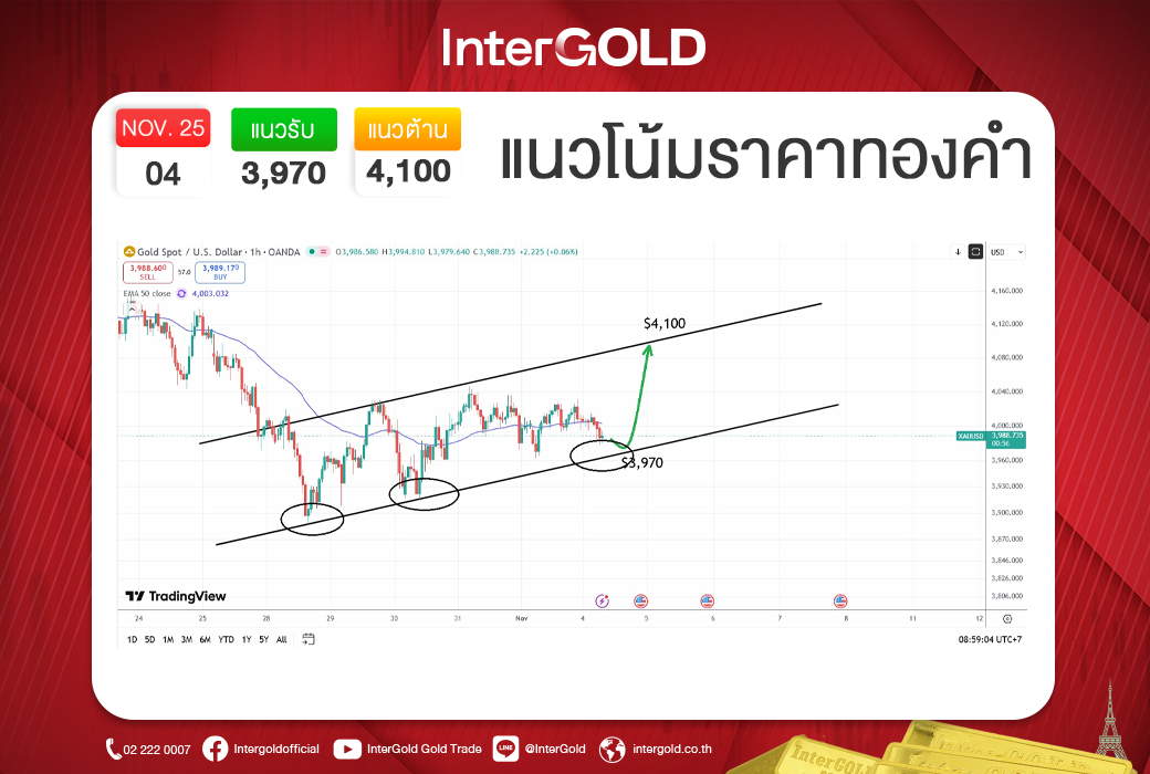 กลยุทธ์การลงทุนวันนี้แนะนำ “ซื้อเมื่อราคาย่อตัวที่แนวรับ $3,970 (≈61,200 บาท) และขายทำกำไรที่แนวต้าน $4,100 (≈62,200 บาท)” ภายใต้กรอบการเคลื่อนไหวแบบ Sideway-Up พร้อมจับตาคดีภาษีศุลกากรสหรัฐฯ ที่อาจสร้างความผันผวนต่อราคาทองคำระยะสั้น