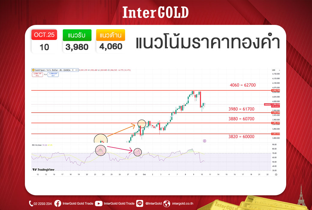 ด้านเทคนิค ทองคำยังอยู่ในช่วงปรับฐาน หลังจากขึ้นแรงกว่า 100 เหรียญ โดย RSI บ่งชี้ว่ายังอยู่ในระดับค่อนข้างแพง มีโอกาสที่ราคาจะย่อตัวลงลึกกว่า 200 เหรียญได้ แต่ในระยะสั้นยังมีโอกาสแกว่งตัวในกรอบเพื่อขึ้นต่อ แนวรับสำคัญอยู่ที่ $3,950 / $3,890 / $3,830 หากราคาย่อตัวลงแรงถือเป็นจังหวะดีในการทยอยสะสม กลยุทธ์แนะนำ “รอย่อลึก ๆ ซื้อ” หรือ Buy on Dip
