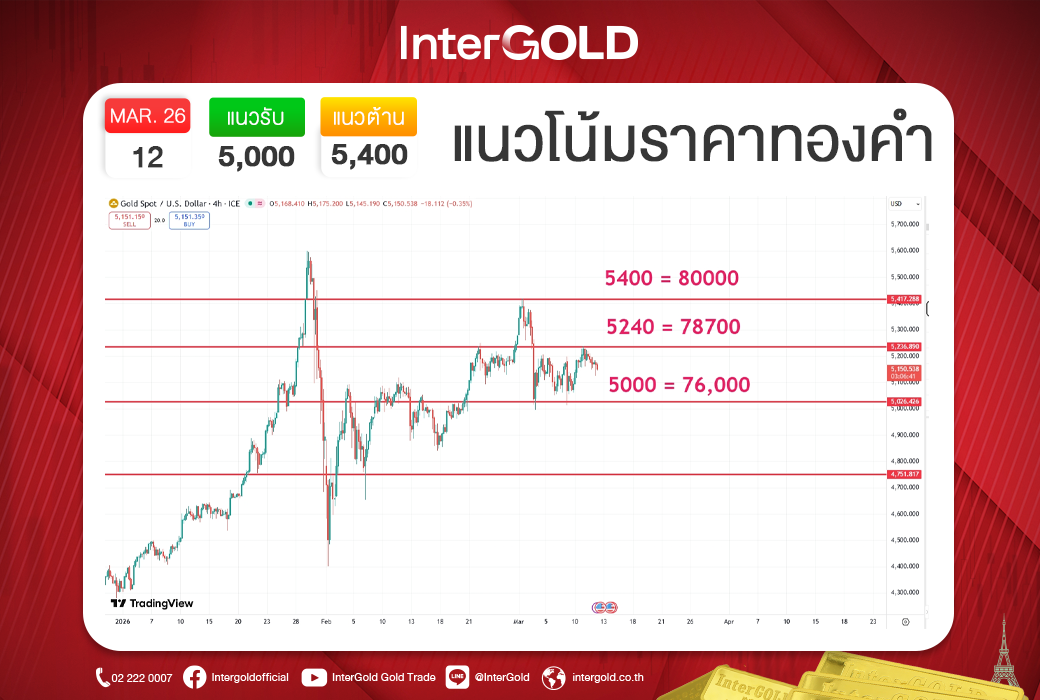 ตราบใดที่สถานการณ์ยังไม่ยกระดับรุนแรงขึ้นมาก ราคาทองคำมีแนวโน้มเคลื่อนไหวในกรอบ โดยประเมินแนวต้านสำคัญไว้ที่บริเวณ $5400 หรือประมาณ 80000 บาท ขณะที่จุดที่เหมาะสำหรับการรอสะสมยังคงอยู่แถว $5000 หรือประมาณ 76000 บาท กลยุทธ์ที่เหมาะสมจึงยังเป็นการ “ย่อซื้อ” เพื่อรอจังหวะขายทำกำไรเมื่อราคาเข้าใกล้แนวต้าน โดยต้องติดตามข่าวสงคราม ตลาดพลังงาน และข้อมูลเศรษฐกิจสหรัฐฯ อย่างใกล้ชิด เพราะทั้งสามส่วนนี้จะเป็นตัวตัดสินว่าทองคำจะยังแกว่งในกรอบ หรือกำลังเตรียมเข้าสู่รอบขึ้นใหม่