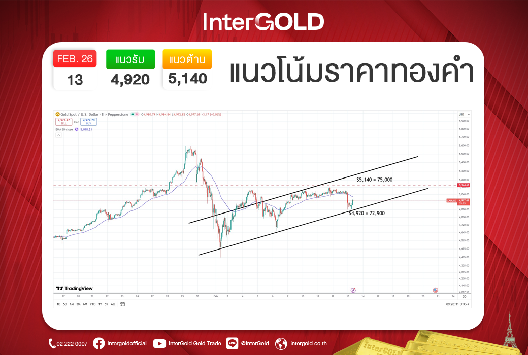 กลยุทธ์ยังเน้น “Sideway-Up” โดยจับตาการยืนเหนือแนวรับสำคัญ $4,920 (ประมาณ 72,900 บาท) หากยังประคองได้ถือว่าแรงซื้อโซนล่างยังแข็งและมีสิทธิ์ไต่กลับไปทดสอบโซนแนวต้าน $5,140 (ประมาณ 75,000 บาท) แผนการเล่นคือรอจังหวะอ่อนตัว/ย่อใกล้แนวรับเพื่อสะสม และเน้นขายทำกำไรเมื่อเด้งขึ้นชนกรอบบนตามเทรนด์ไต่ขึ้นแบบค่อยเป็นค่อยไป พร้อมติดตามความผันผวนจากสินทรัพย์เสี่ยงและทิศทางดอลลาร์เป็นตัวกำหนดจังหวะเร่ง/ผ่อนของการรีบาวด์