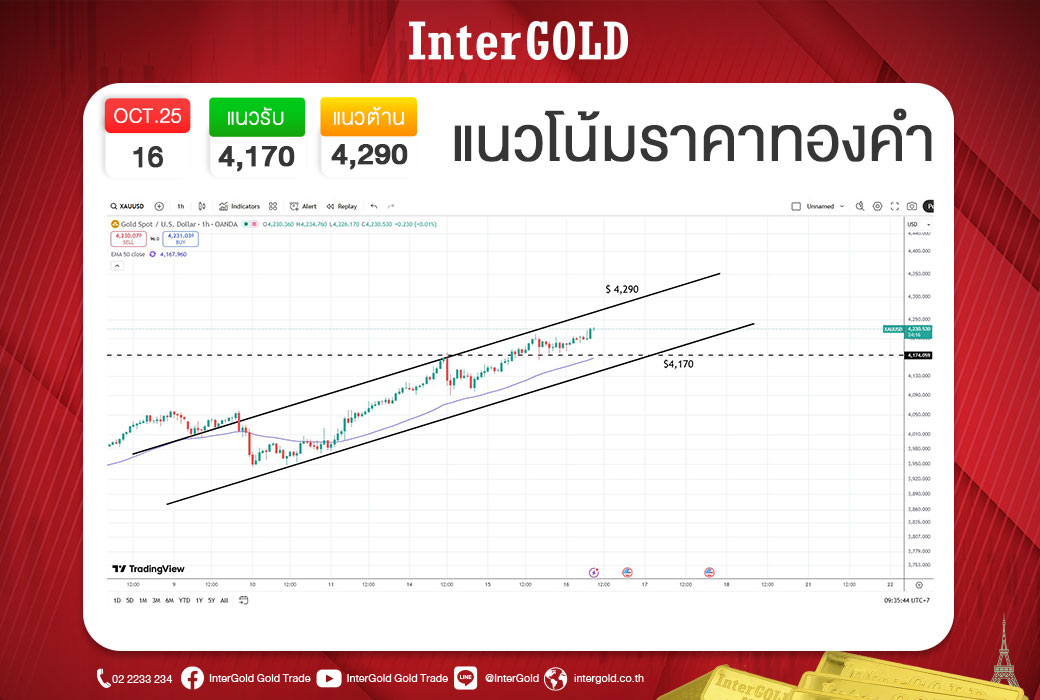 ความตึงเครียดทางการค้าระหว่างสองประเทศยิ่งทวีความรุนแรง หลังทรัมป์ขู่ตอบโต้ด้วยการควบคุมการส่งออกชิ้นส่วนของ Boeing และอาจยกเลิกการพบปะกับสี จิ้นผิง หากจีนไม่ยอมถอยในประเด็นแร่หายาก ส่งผลให้นักลงทุนแห่เข้าซื้อทองคำในฐานะสินทรัพย์ปลอดภัย ด้านเทคนิคคัล ราคาทะลุระดับ 4,200 ดอลลาร์ แต่มีโอกาสพักฐานที่แนวรับ 4,170 ดอลลาร์ (64,200 บาท) ก่อนกลับขึ้นไปทดสอบแนวต้านถัดไปที่ 4,290 ดอลลาร์ (65,500 บาท) ตามแนวโน้มขาขึ้น (Uptrend)