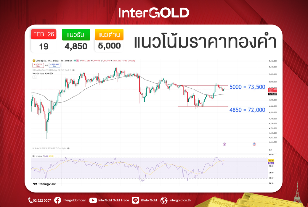 กลยุทธ์ที่สื่อคือ “ลุ้นปรับฐานระยะสั้น แต่ยังเน้นจังหวะย่อเพื่อสะสม” โดยกำหนดกรอบสำคัญไว้ที่แนวรับ $4,850 (ประมาณ 72,000 บาท) และแนวต้าน $5,000 (ประมาณ 73,500 บาท) โฟกัสหลักคือรอให้ราคาย่อลงมาในโซนรับแล้วค่อยวางแผนเข้าทีละไม้ มากกว่าการไล่ซื้อบริเวณแนวต้าน พร้อมติดตามตัวเร่งที่ทำให้ผันผวนต่อเนื่อง เช่น น้ำหนักท่าทีเฟด/ยีลด์ และข่าวภูมิรัฐศาสตร์ ซึ่งเป็นปัจจัยที่ทำให้ราคาแกว่งแรงได้ในช่วงสั้นๆ