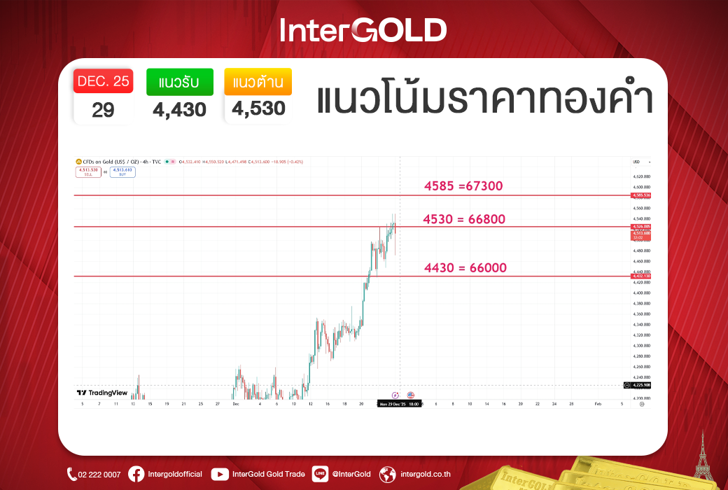 โครงสร้างราคาวันนี้สะท้อนภาพ “ลงแรงแต่เด้งไว” จึงยังตีความเป็นการพักตัวจากแรงขายทำกำไรระยะสั้นมากกว่าการกลับตัวเป็นขาลงเต็มรูปแบบ การรีบาวด์เร็วและกลับมายืนเหนือโซนสำคัญได้ ทำให้เทรนด์หลักยังดูแข็งแรง แต่ความผันผวนมีโอกาสสูงต่อเนื่องจากทั้งปัจจัยข้อมูลเศรษฐกิจและสภาพคล่องบางช่วงปลายปี-ต้นปี ในเชิงเทคนิค โซนแนวรับสำคัญอยู่แถว $4,430 (ประมาณ 66,000 บาท) และโซนย่อยที่ตลาดจับตาคือ $4,460–4,470 ว่าย่อแล้วรับอยู่หรือไม่ ขณะที่แนวต้านหลักอยู่แถว $4,530 (ประมาณ 66,800 บาท) และถ้าผ่านโซนสำคัญถัดไปได้ ภาพจะกลับเข้าสู่โหมด “ไปต่อ” ชัดขึ้น